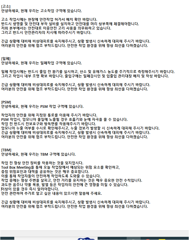 그럼, 현장에 나갔던 밀폐작업 안전수칙 안내멘트 2가지를 들어볼까요?